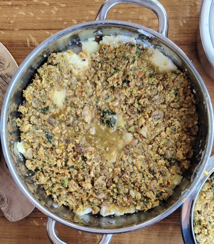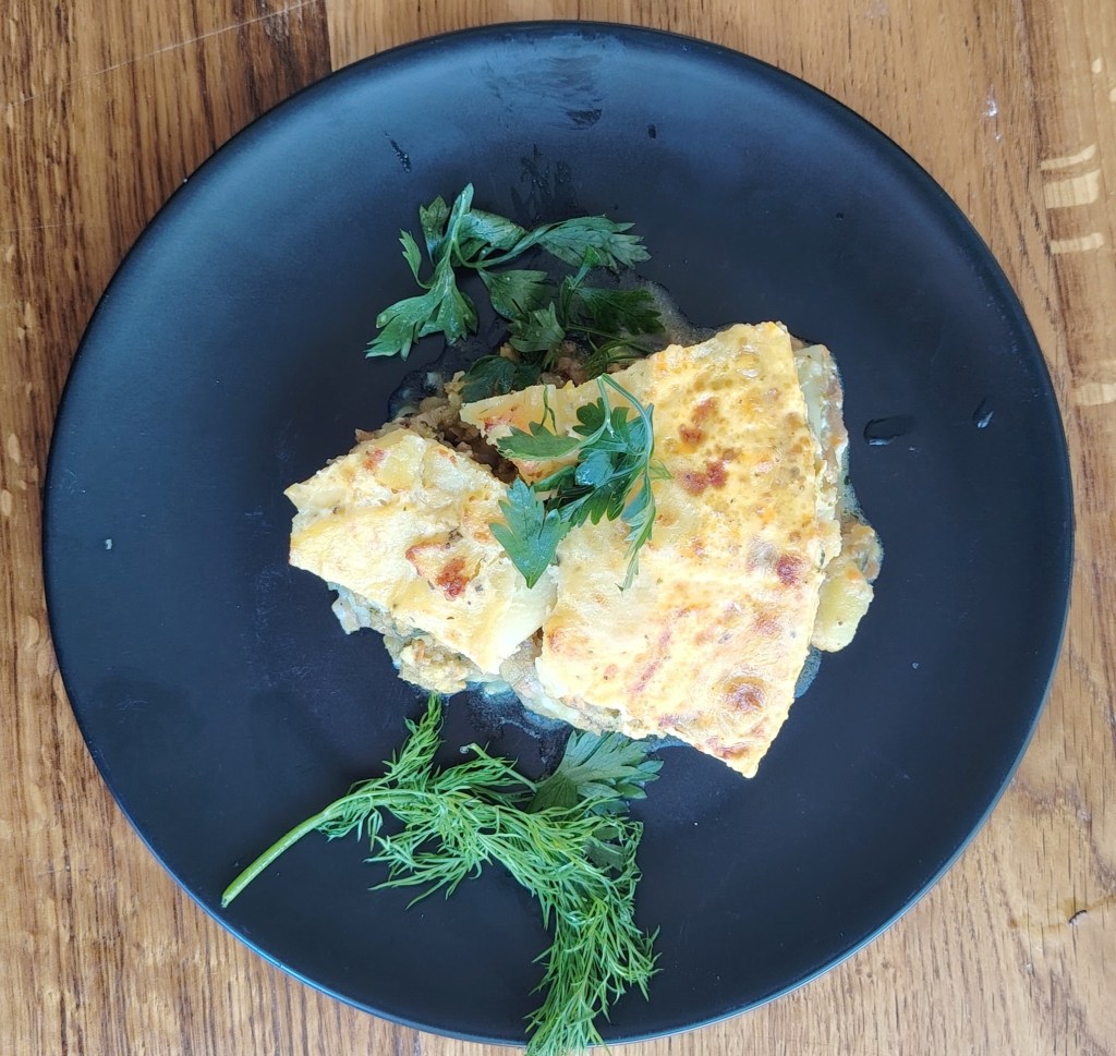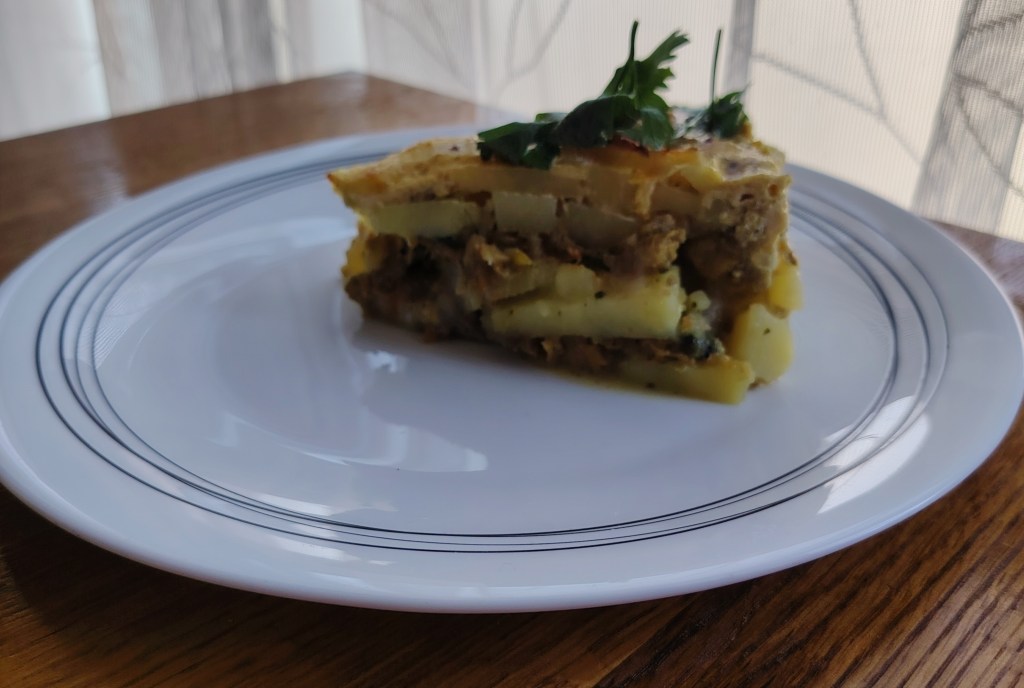 Krumpir izrezati na tanje ploške i prokuhati 5 minuta (začiniti ga sa soli i mediteranskim miksom začina). Dinstati meso (i povrće). Dodati sol, kurkumu i mediteranski mix. Bešamel raditi na klasičan način: popržiti na tri žlice ulja 2 do 3 žlice brašna, zaliti s mlijekom. Dobro miješati da nema grudvica, dodati sol i žličicu muškatnog oraščića. U okruglom ili četvrtastom kalupu redati krumpir, meso (s povrćem), preko toga bešamel umak pa opet krumpir, meso, bešamel umak, dok se ne utroši materijal. Preliti s umućenim jajima s jogurtom. Peče se na 190 stupnjeva oko 60 minuta.