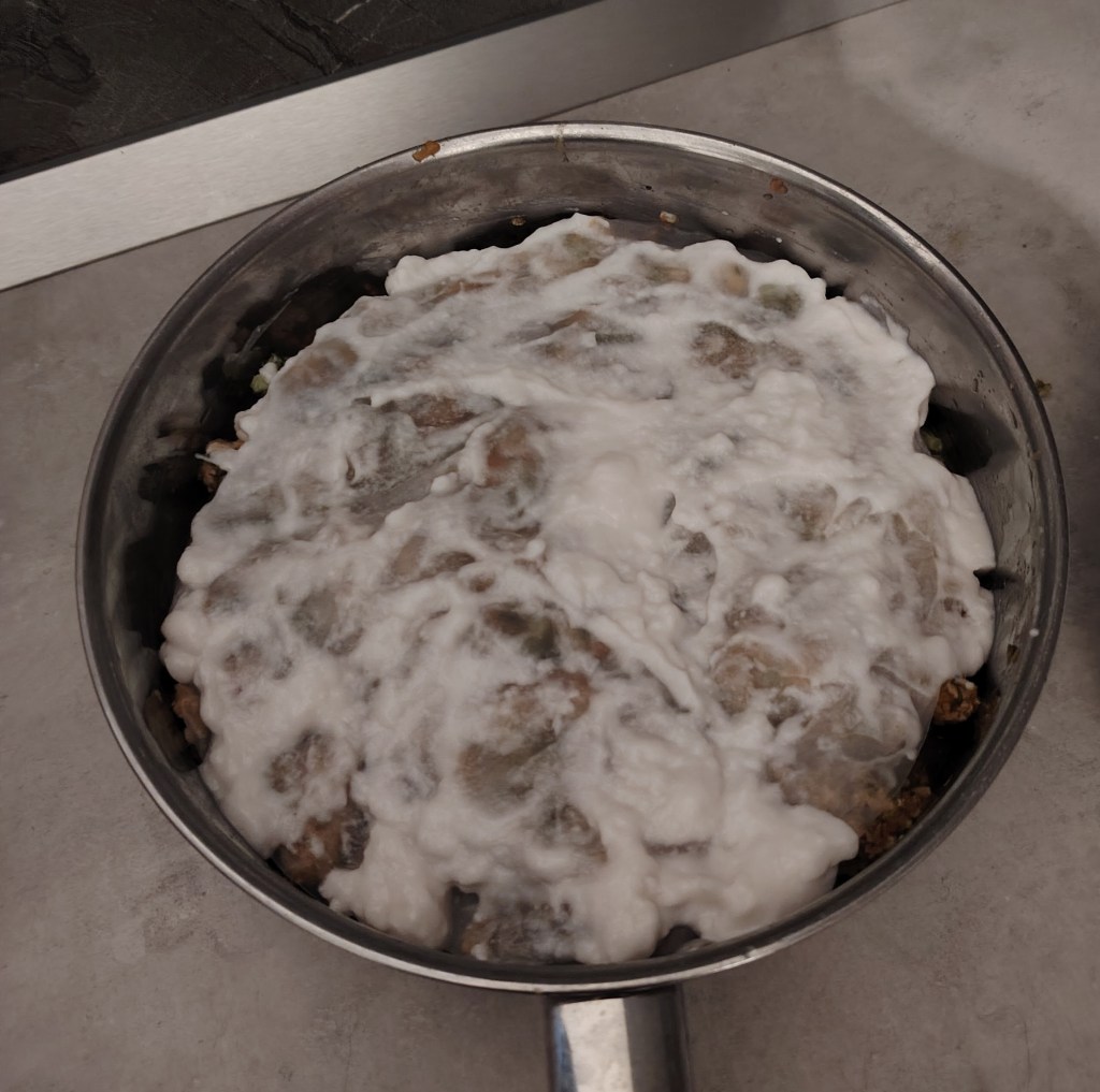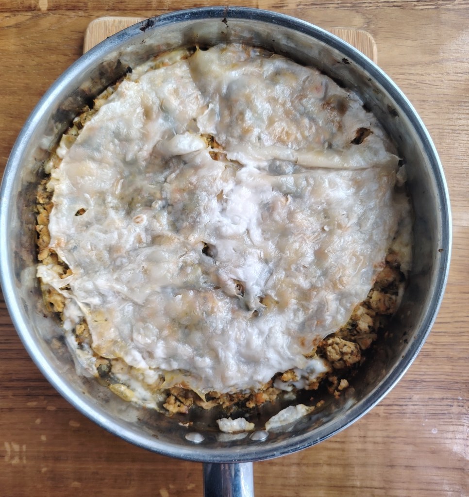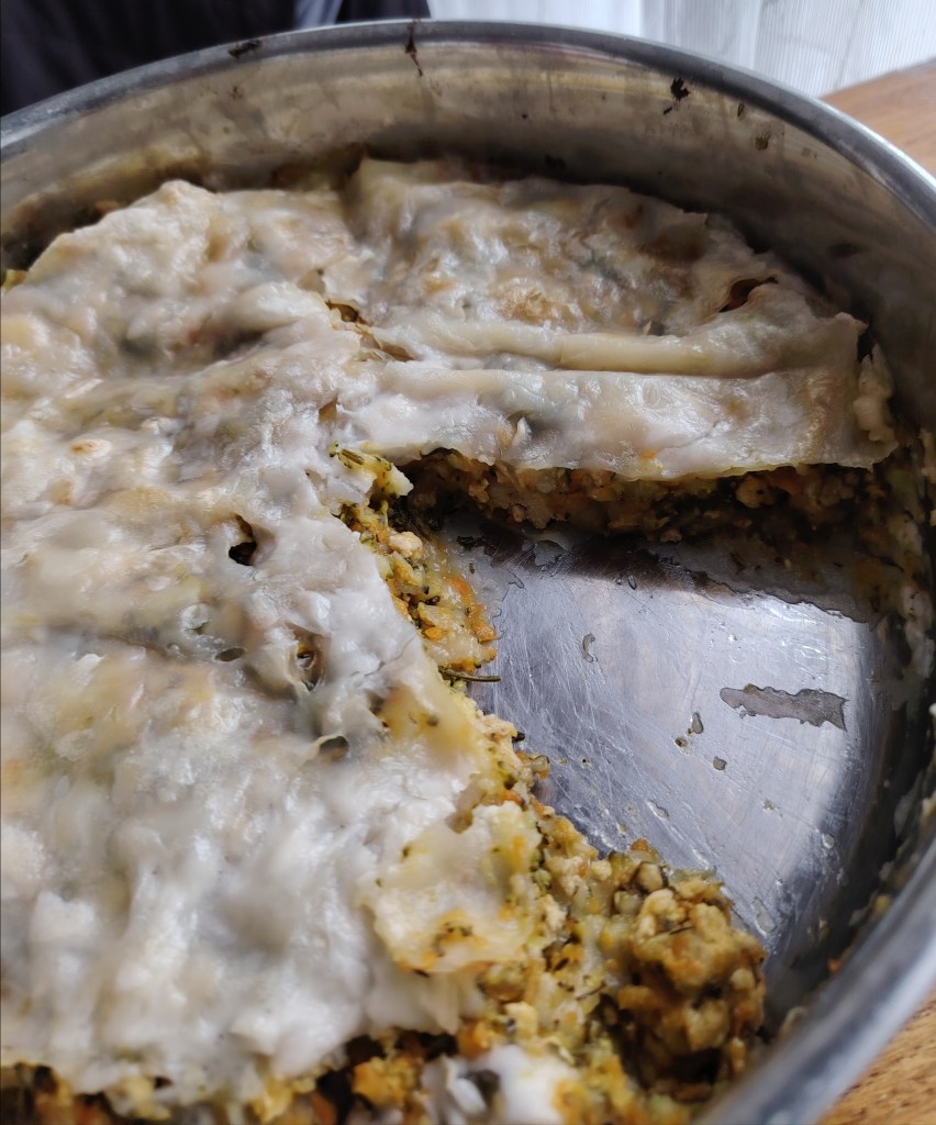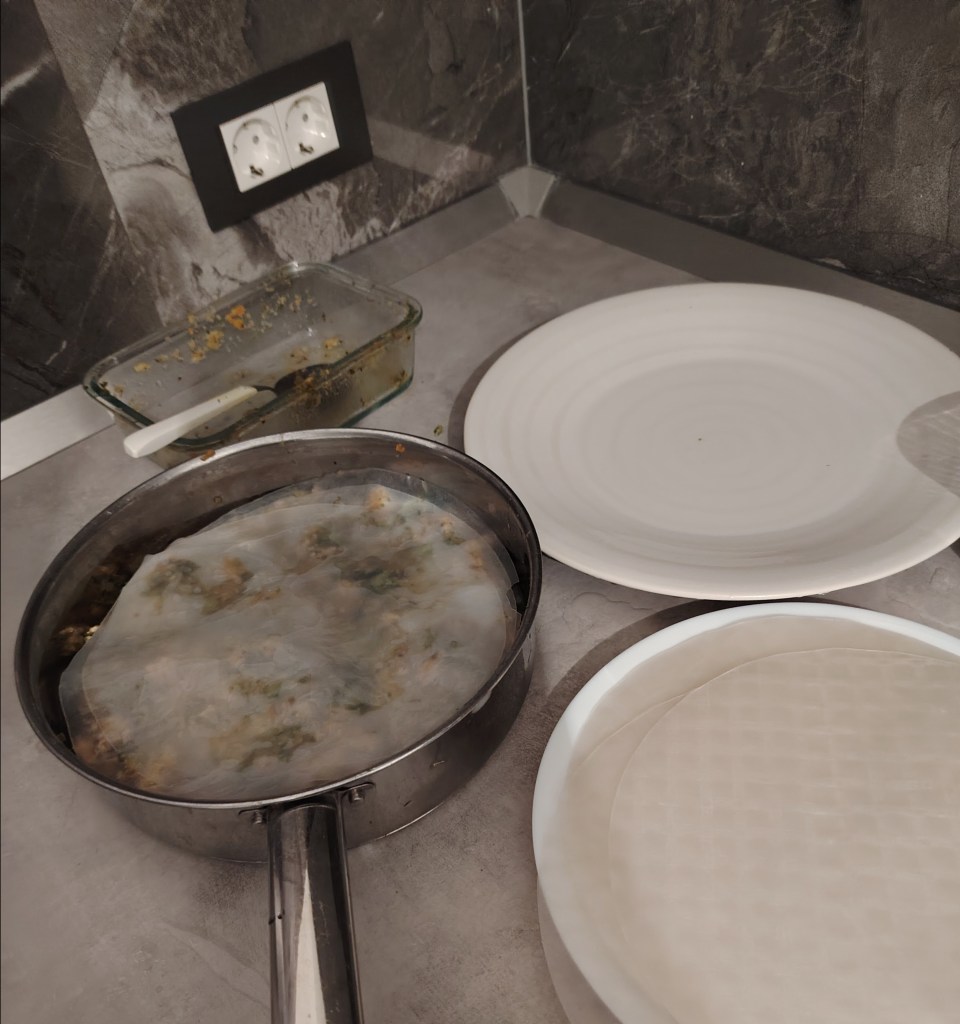 Meso (samo ili s povrćem) dinstati na uobičajen način. Kada se ohladi slagati burek. Kalup (u ovom slučaju tava promjera rižinog lista koja može ići u pećnicu) se lagano zamasti s četkicom. U jednu posudu se stavi topla voda u koju se uroni rižin papir. Drži se kratko dok ne postane savitljiv i podatan te se stavi na dno pleha, najmanje dva, a može i tri papira jedan na drugi pa po tome se rasporedi punjenje. Ponavlja se dok se ne utroši materijal. Treba završiti s tri rižina papira. Premaže se s kokosovim jogurtom i stavi peći na 190 stupnjeva. Peče se 45 minuta od toga u polovici pečenja uključi se ventilator. Kada je pečeno ostavi se da se ohladi otvoreno.