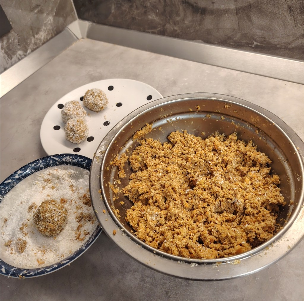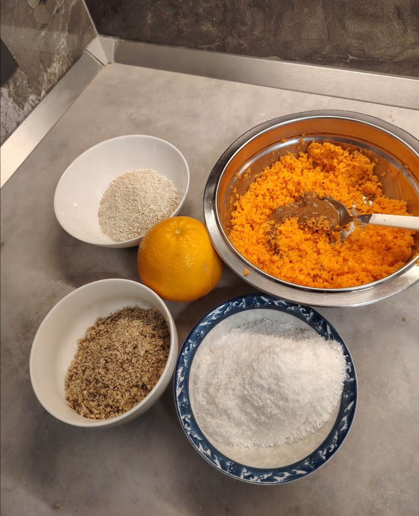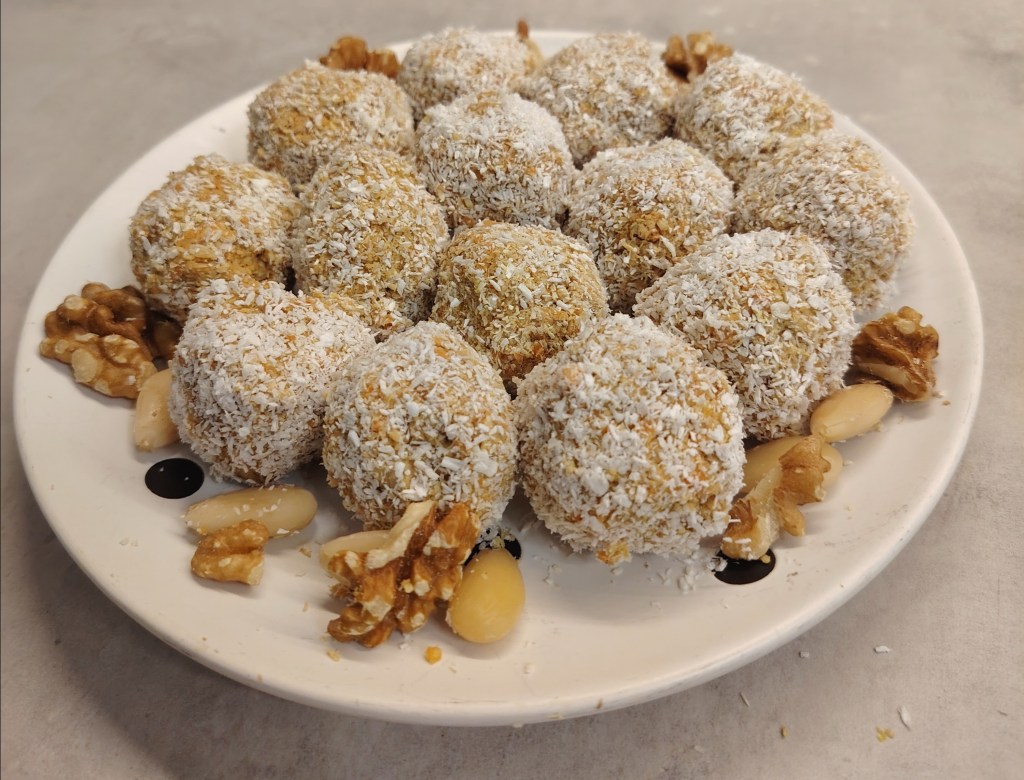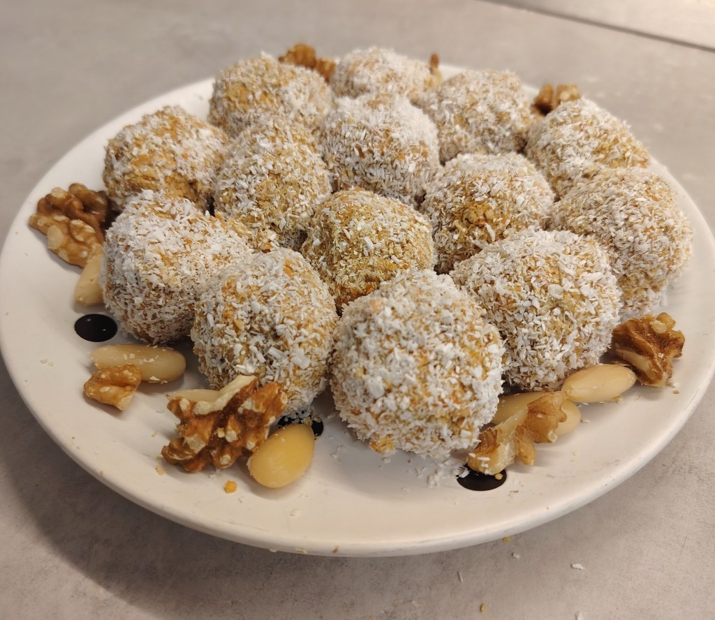 Usitniti: zobene pahuljice, orahe i mrkvu. Ovim sastojcima dodati kokos, bademov maslac, cimet i zamijesiti. Po potrebi dodati još soka od naranče kako bi se mogle od smjese oblikovati kuglice. U svaku kuglicu se stavi dva oguljena badema i oblože se kokosom. Držati u hladnjaku.