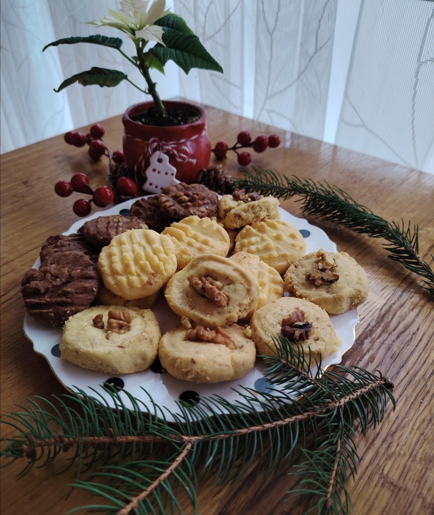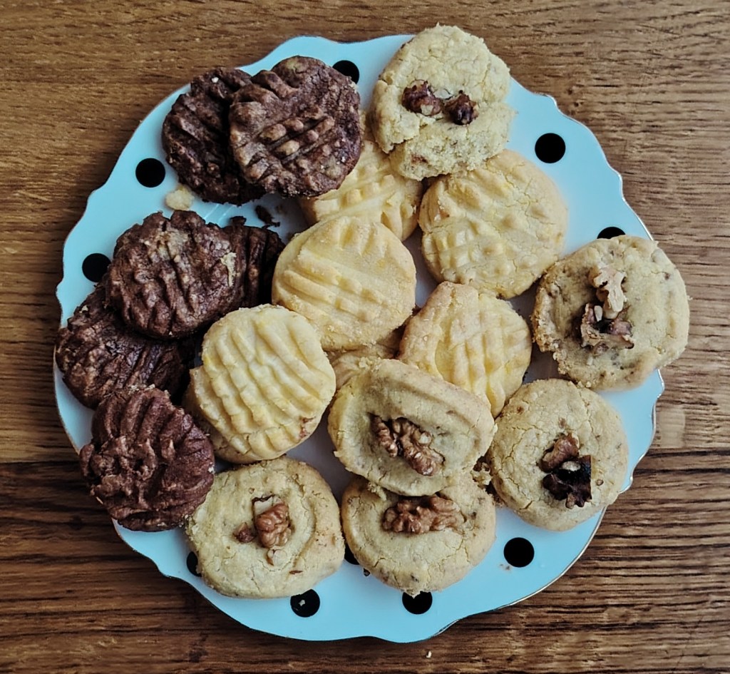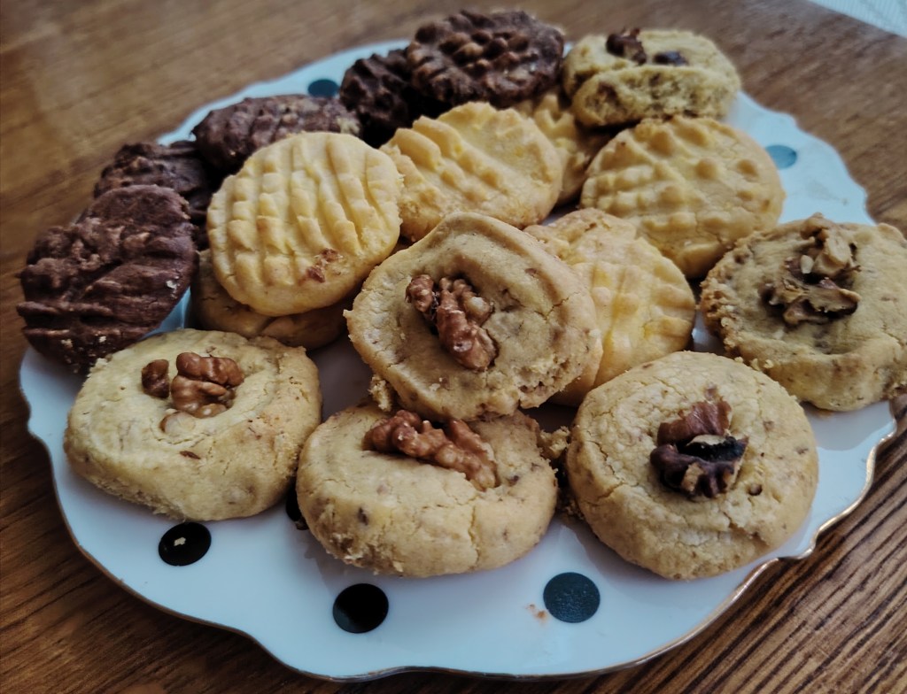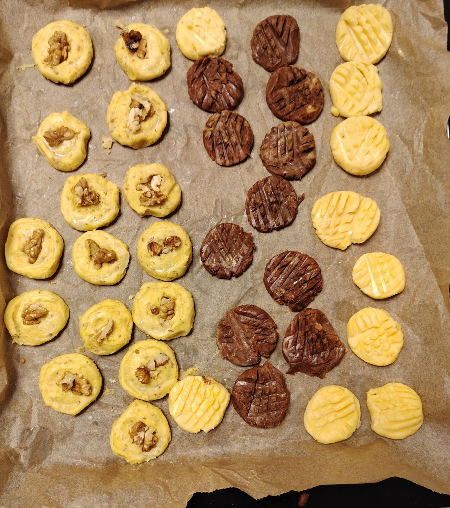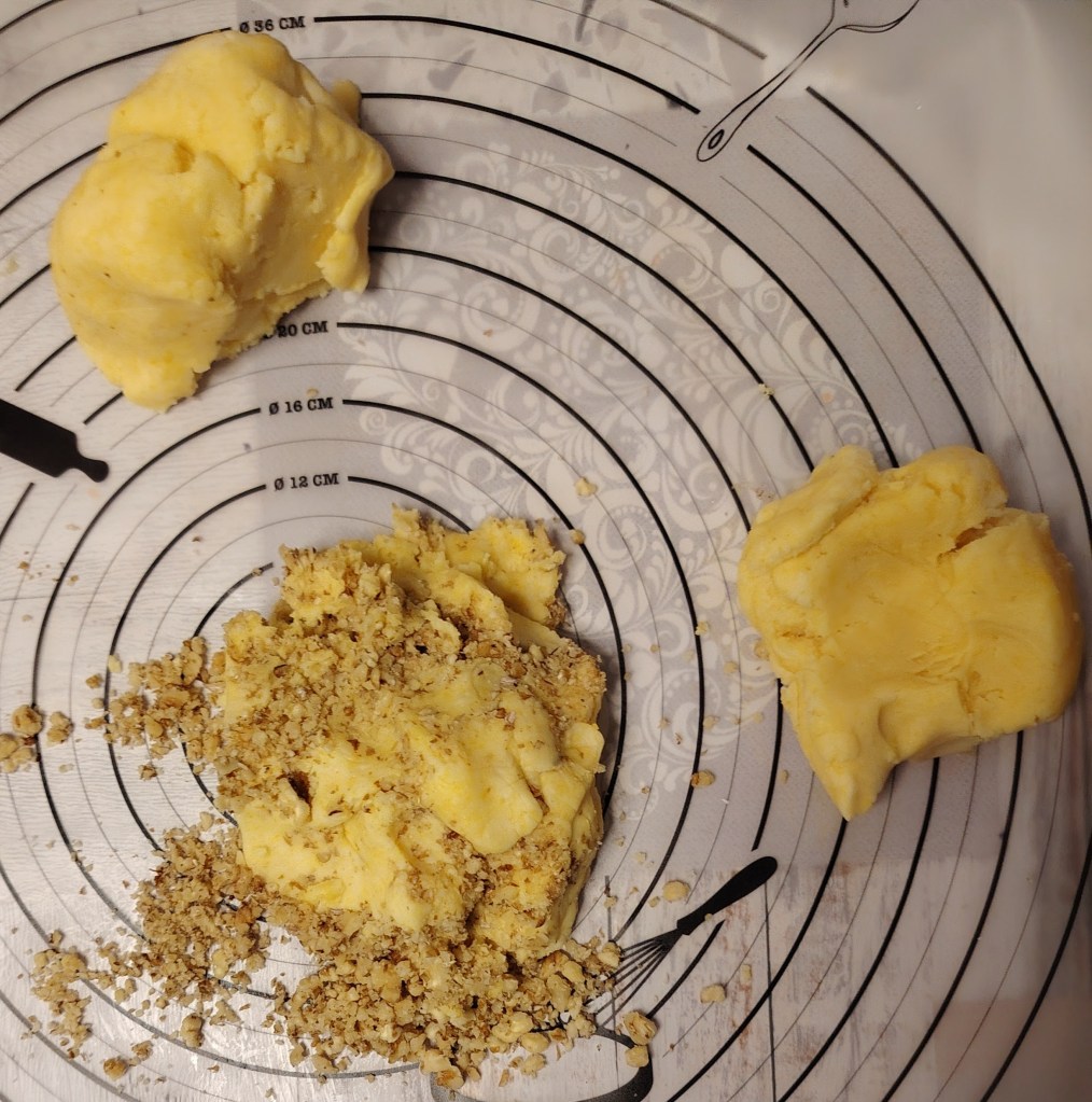 U brašno i puding prah se stavi hladan maslac i dobro izmrvi s brašnom, doda se sladilo i zamijesi tijesto koje nije ljepljivo. Smjesa se podijeli na tri dijela. Prvi dio ostaje kakav jeste. Ne mora se razvaljati, mogu se kidati komadići tijesta i praviti kuglice koje se stavljaju u pleh obložen papirom za pečenje. S vilicom se kuglice razvuku u medaljon. U drugi dio tijesta dodaju se mljeveni orasi (može malo krupnije) i umijesi se u tijesto. Oblikuju se kuglice i stanje s čašicom u medaljon te se na vrh stavi komadić oraha. U treću smjesu se stavljaju ploškice kakao paste otopljene na štednjaku s malo vode (ili otopljena tamna čokolada). I ove se kuglice prave na isti način – kakao (čokolada) se umiješa u treći dio tijesta te se prave kuglice koje se s vilicom splošte u medaljon i stavi na papir za pečenje u plehu.