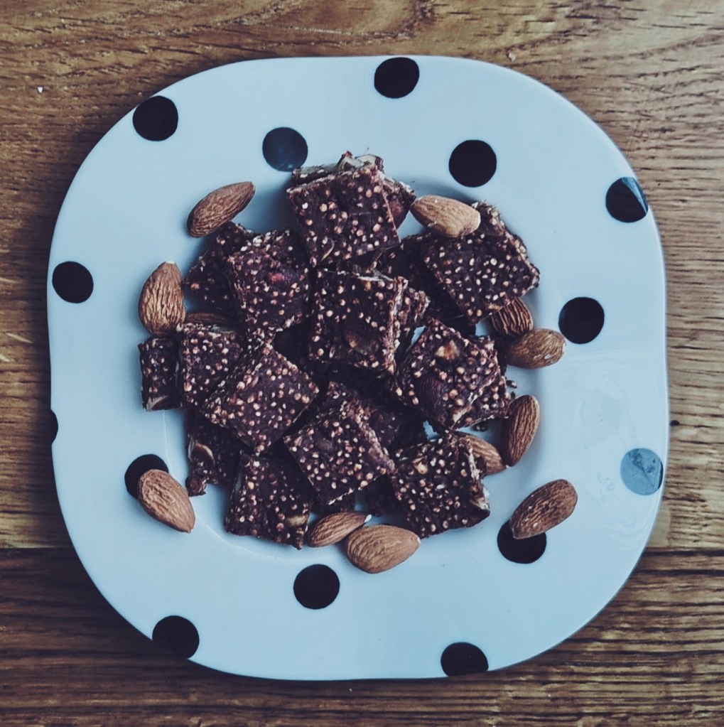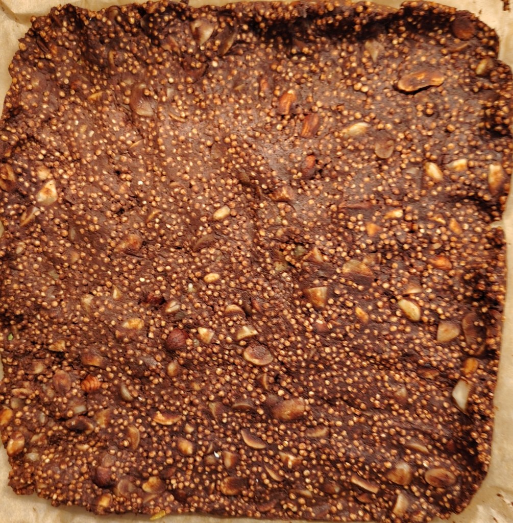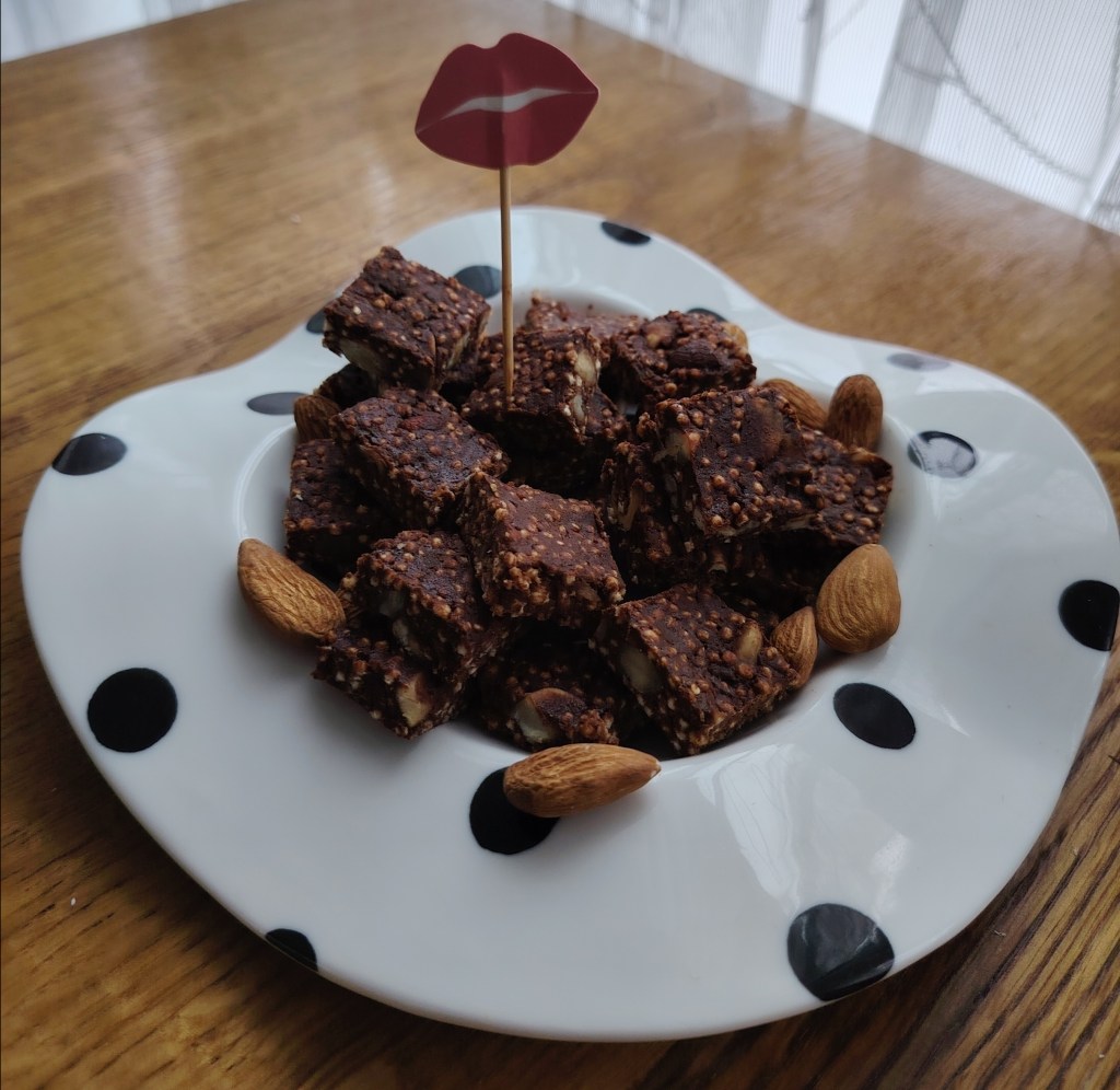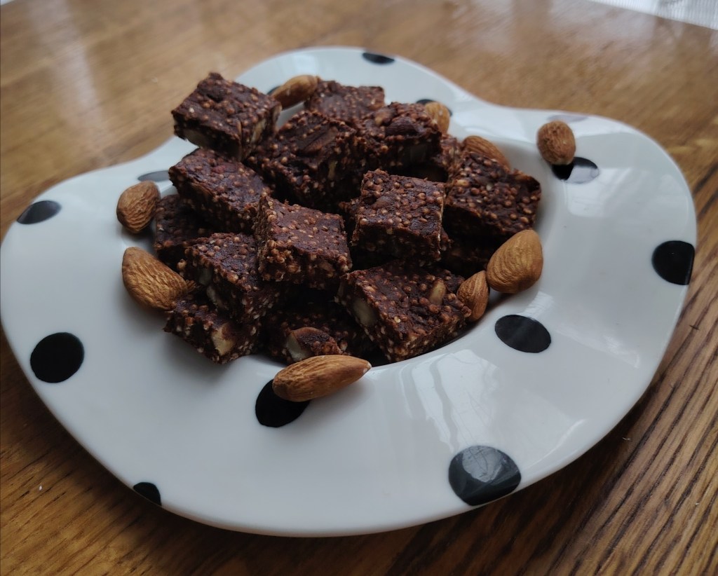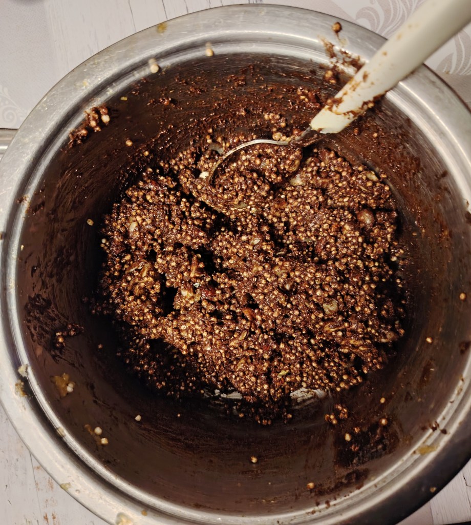 U posudi kuhati datulje ili pastu od datulja, čokoladu, cimet, sok mandarine i dodati vode da se sastojci spoje kuhajući na laganoj vatri. Kada je smjesa otopljenja u nju staviti ostale sastojke. Smjesu staviti u pleh prekriven papirom za pečenje (ovdje je veličina pleha 23×23 cm) i dobro utisnuti pritiskajući rukama, Staviti u hladnjak najmanje na sat vremena. Rezati male kockice koje se mogu držati u teglici u hladnjaku ili zamrznuti.