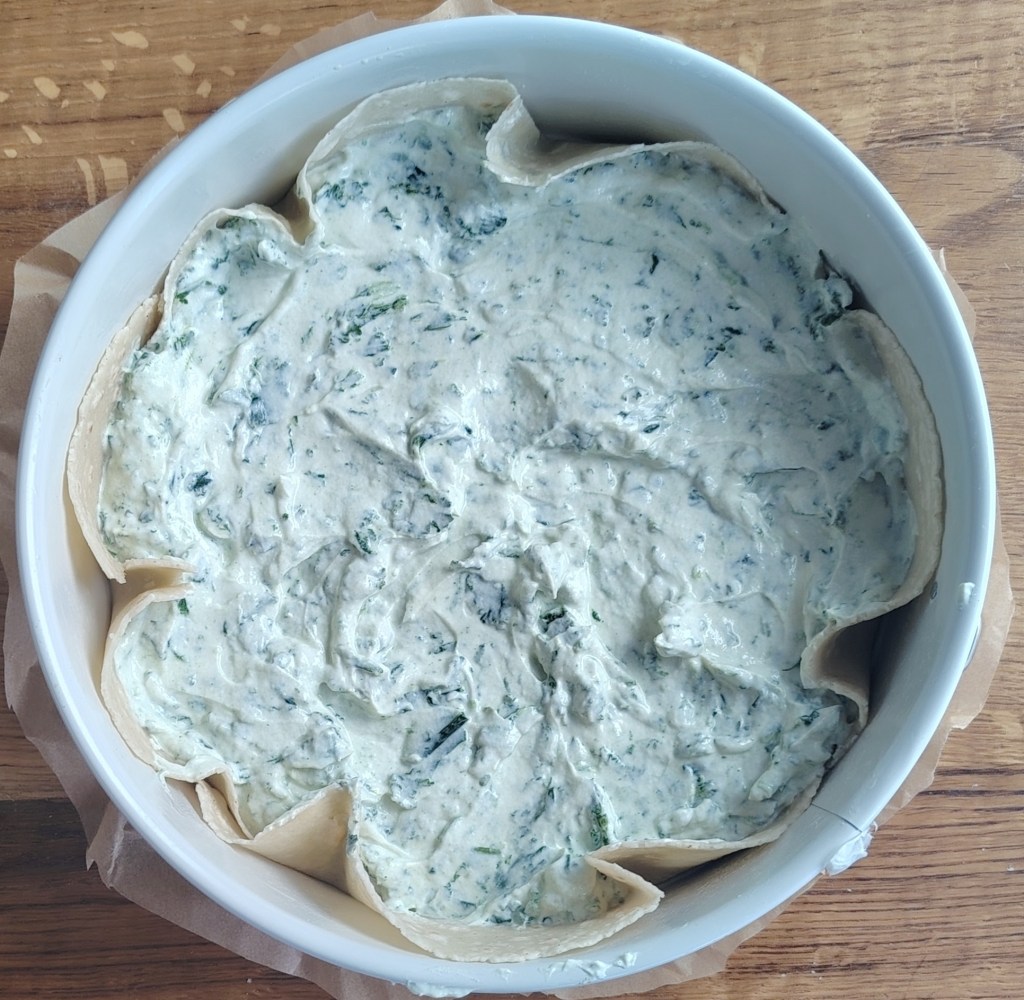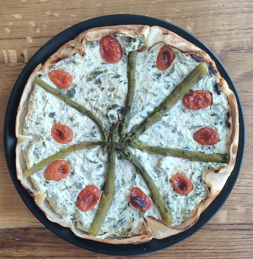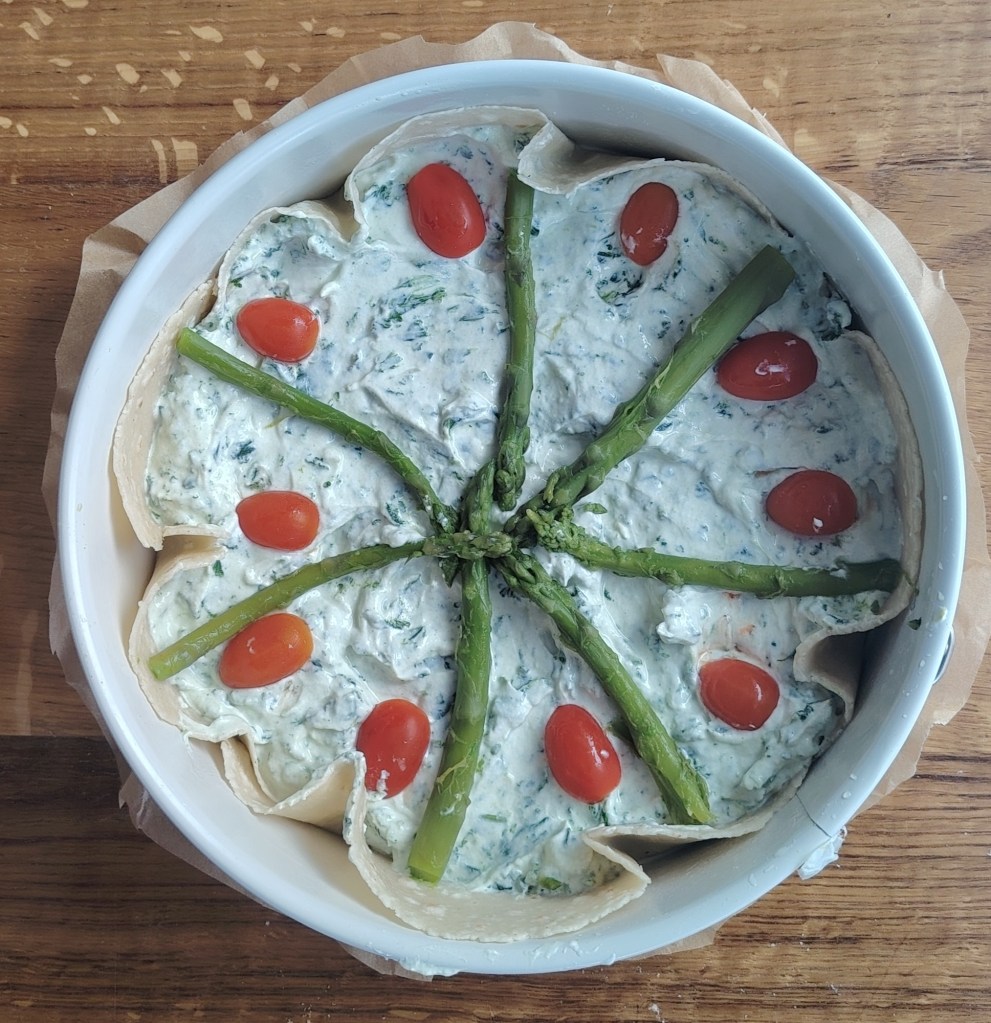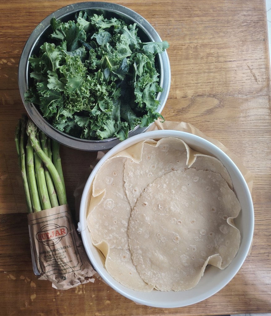 U kalupu za torte (dno obložiti papirom za pečenje, a rubove premazati maslacem) složiti u krug četiri tortilje da su mali uzdignute iznad donjeg ruba. Siru dodati sol, jaje, mediteranske začine i skuhani lisnati kelj. Istresti na tortilje poravnati i staviti preko sira kuhane šparoge. Peći na 190 stupnjeva 30-tak minuta. Jede se toplo i hladno.
