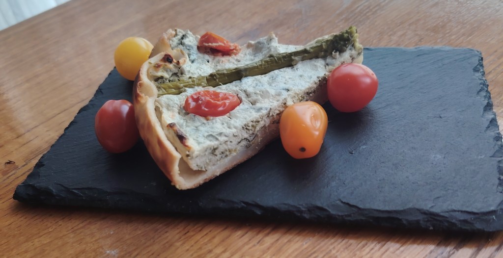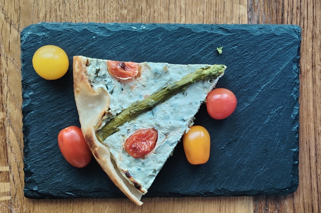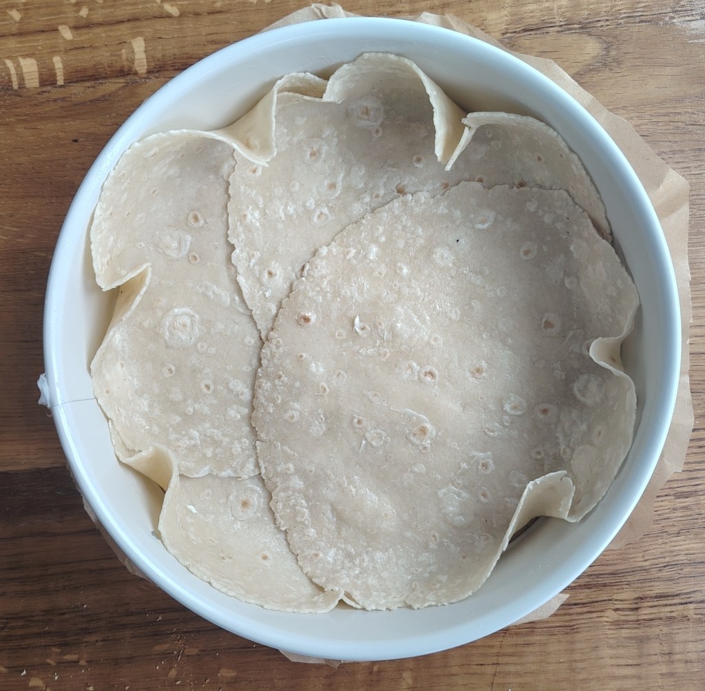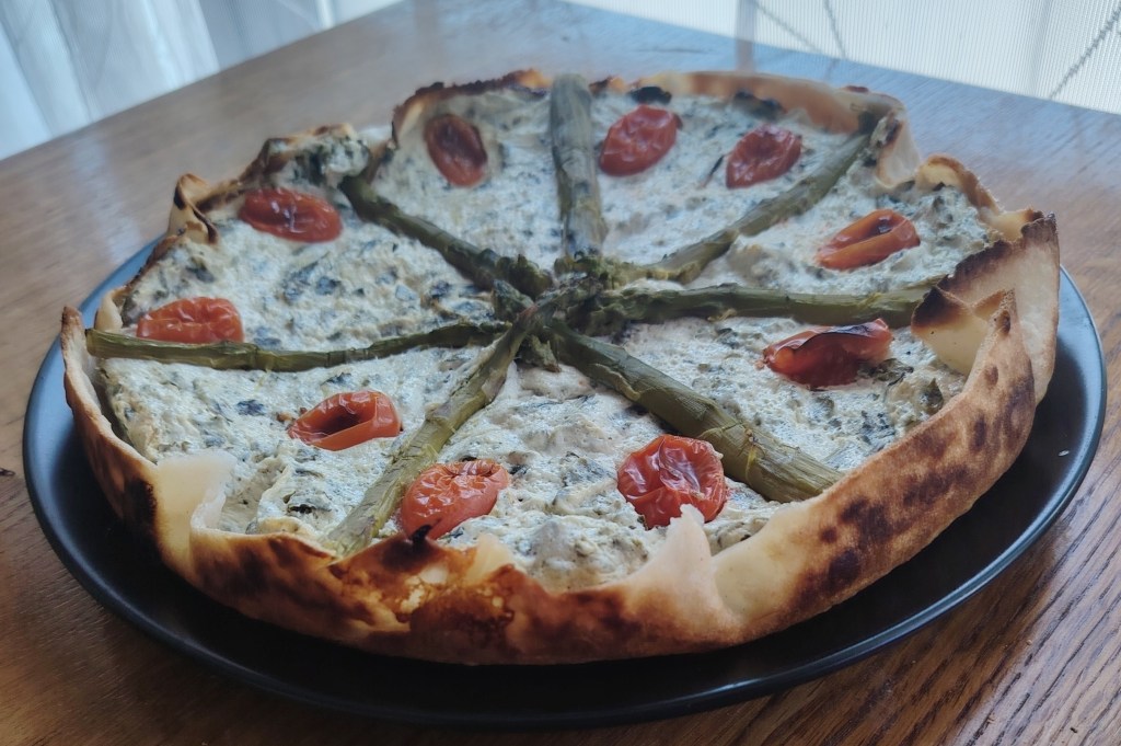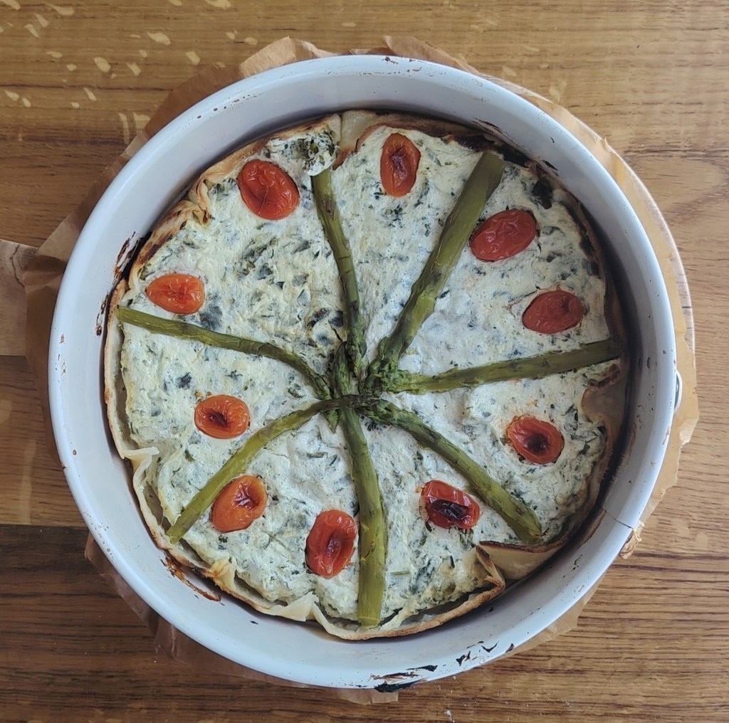 U kalupu za torte (dno obložiti papirom za pečenje, a rubove premazati maslacem) složiti u krug četiri tortilje da su mali uzdignute iznad donjeg ruba. Siru dodati sol, jaje, mediteranske začine i skuhani lisnati kelj. Istresti na tortilje poravnati i staviti preko sira kuhane šparoge. Peći na 190 stupnjeva 30-tak minuta. Jede se toplo i hladno.
